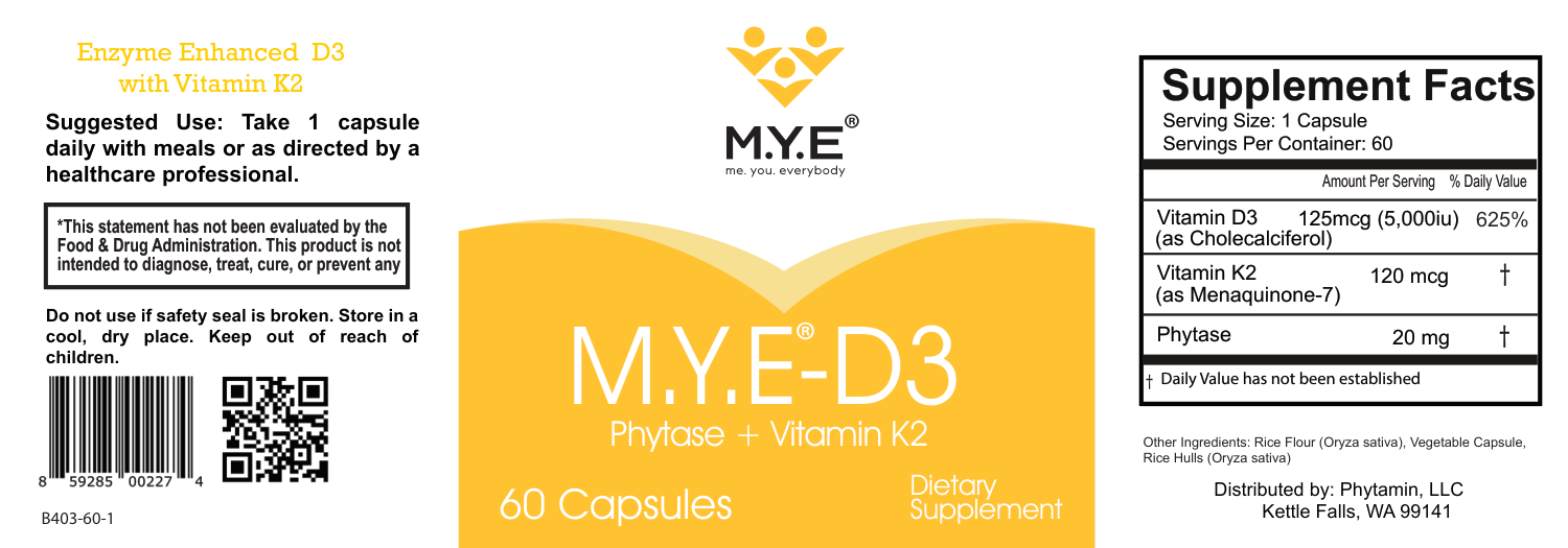 M.Y.E®-D3 is a next-generation Vitamin D₃ supplement designed to support bone strength, immune balance, and whole-body vitality. Each capsule delivers 5,000 IU (125 mcg) of highly bioavailable cholecalciferol, scientifically paired with the enzyme Phytase and Vitamin K2 to promote optimal nutrient utilization and absorption.